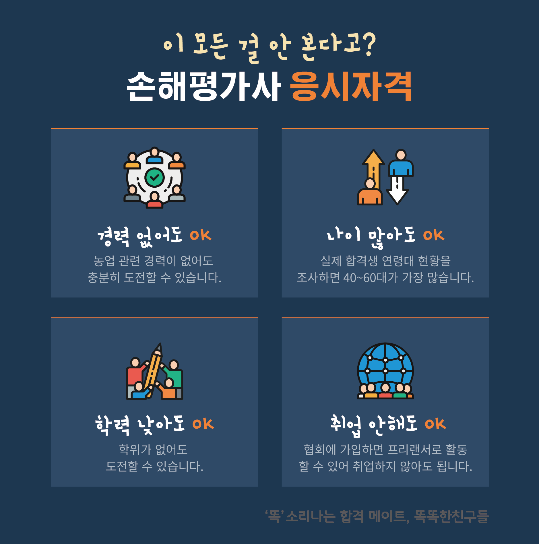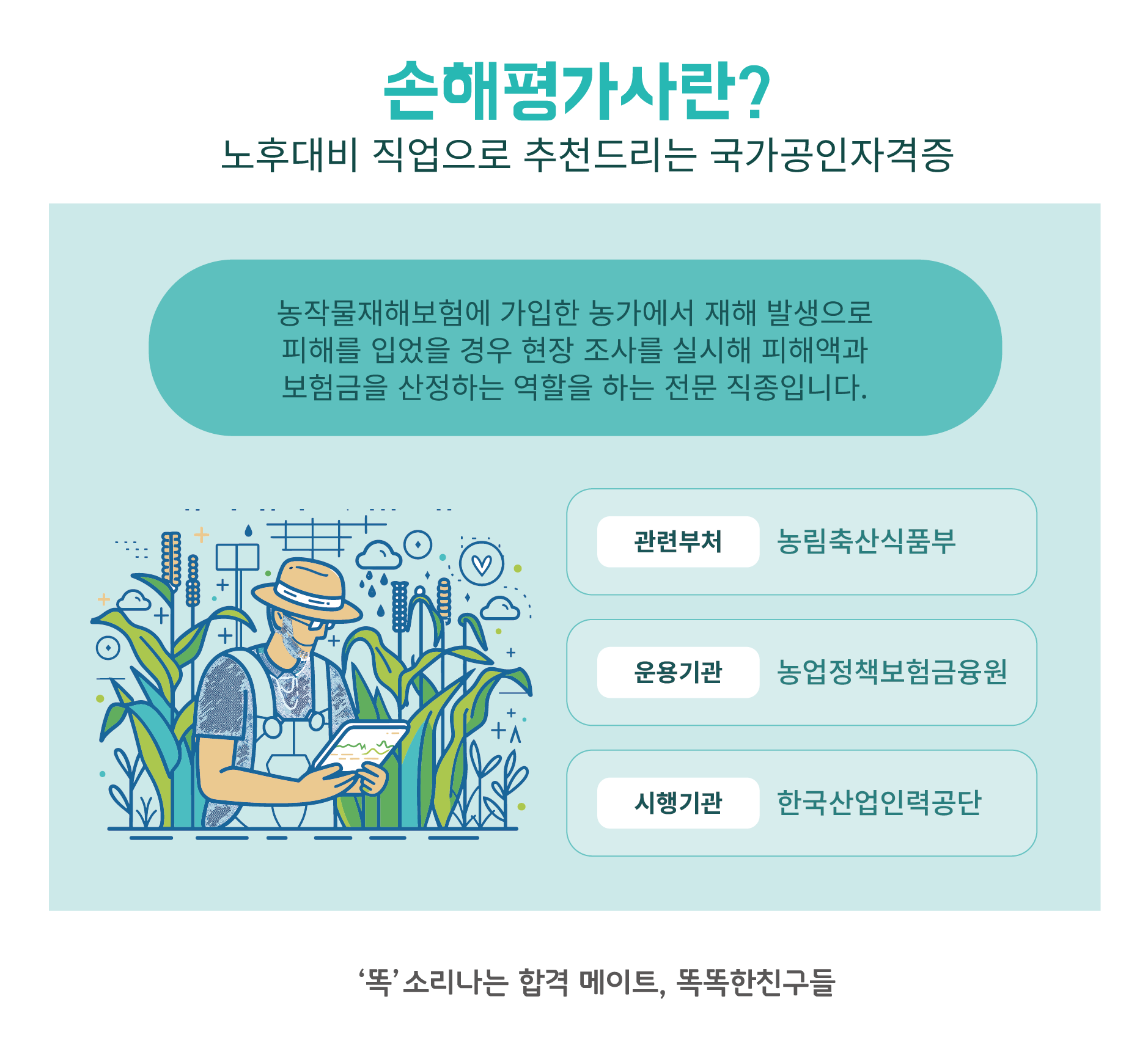 손해평가 자격시험 1차 및 2차 시험에 합격하여야 자격 취득이 이루어지며, 현재 한국산업인력공단에서 손해평가 자격시험을 시행하고 있습니다.