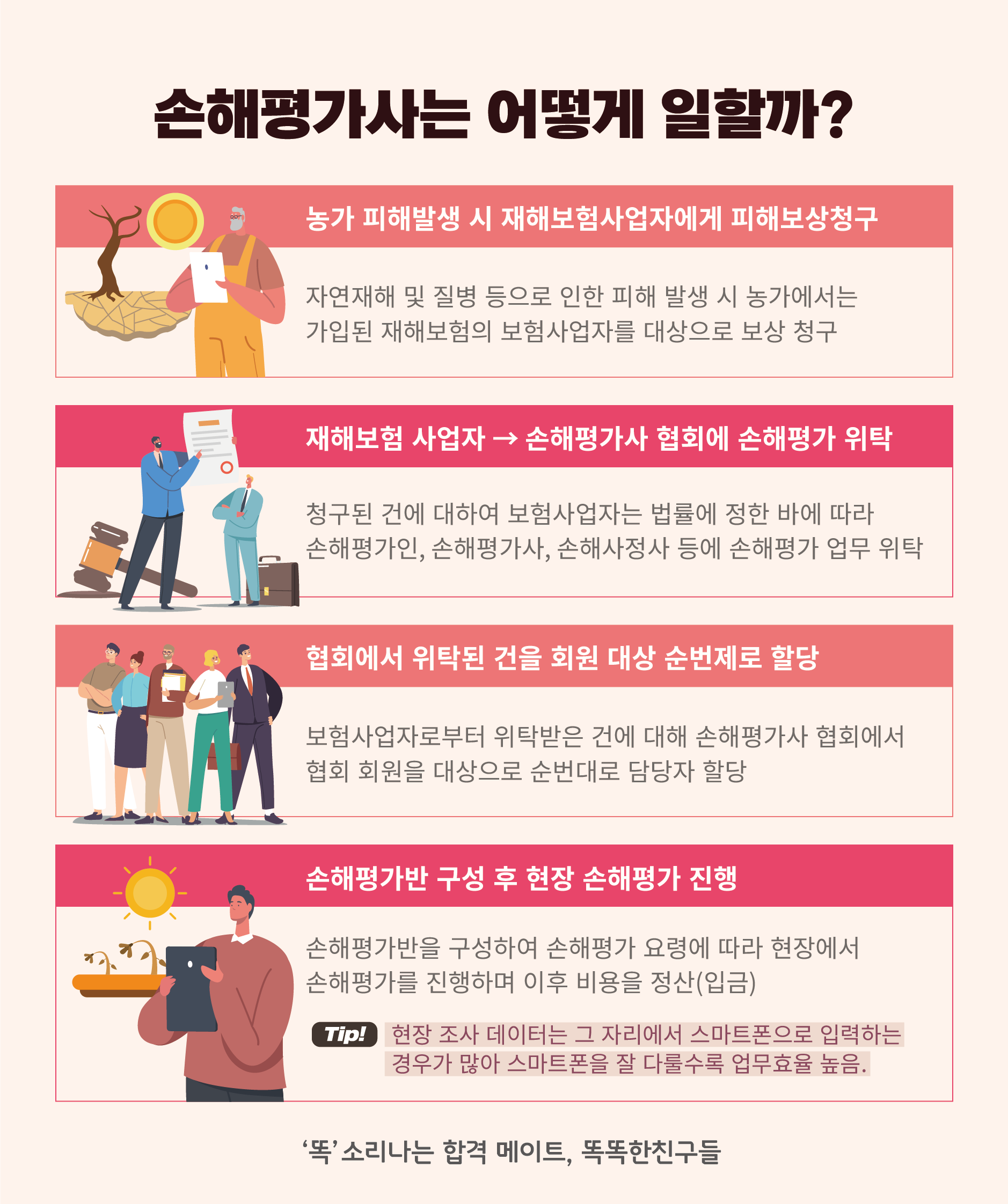 자연재해•병충해 화재 등 농업재해로 인한 보험금 지급사유 발생 시 신속하고 공정하게 그 피해사실을 확인하고, 보험가액 및 손해액의 평가, 그 밖의 손해평가에 필요한 사항에 대한 업무를 수행합니다.